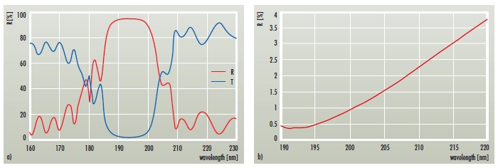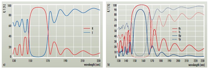 图1:157nm的激光镜(AOI = 0°,a)和转向镜(AOI = 45°,b)的测量反射率和透射光谱