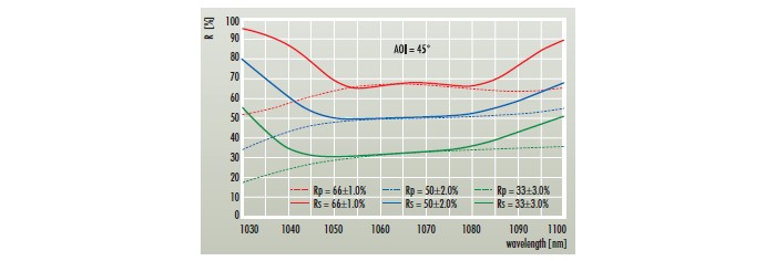 •对于AOI = 45°的Rs?Rp(| Rs-Rp | <1.5%)和不同程度的反射率的分束器