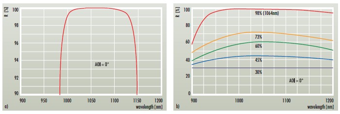 图1:具有不同程度的反射率的高功率腔镜(a)和输出耦合器的反射光谱(b)
