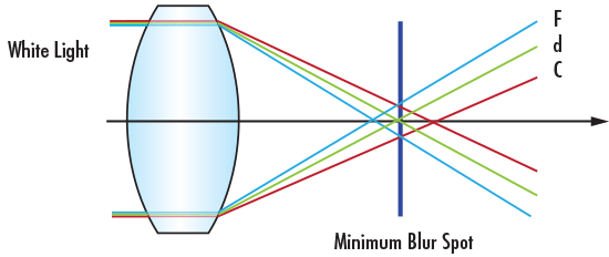 Chromatic aberration results from material dispersion. Because different colors of light refract by different amounts, an image point formed by light of one color does not coincide with the corresponding image point formed by light of a different color (Figures 2.1 and 2.2).