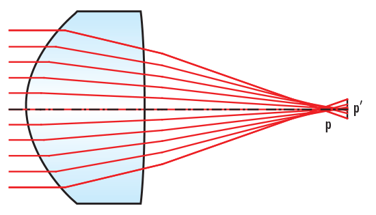 There are two major forms of axial optical aberrations inherent in common optical lenses: spherical aberration and chromatic aberration. Spherical aberration is an inherent characteristic of any lens whose surface is a section of a sphere. Light originating from the same object point comes to a focus at slightly different points (P and P’), depending on whether the rays pass through the center of the lens or the periphery (Figure 1).