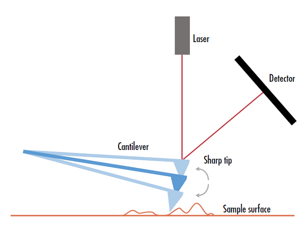 探针在与系统保持持续接触(称为接触模式)或与表面保持间歇接触(称为轻敲模式)时扫描整个样本。在轻敲模式下,悬臂以其谐振频率振荡,在振荡周期内,探针只与表面接触较短时间。接触模式比轻敲模式更简单,能更准确地重建表面。不过,该模式在扫描过程中损伤表面的可能性更大,探针磨损更快,导致针尖寿命更短。在这两种模式下,激光从悬臂顶部反射到探测器上。样本表面的高度变化使悬臂发生偏转,改变了激光在探测器上的位置,生成了表面高度图(图3)。