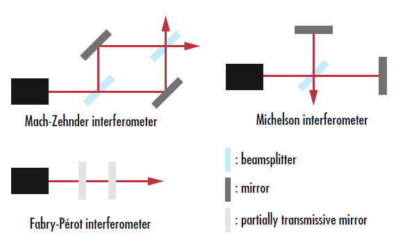 有几种常见的干涉仪配置(图 8)。马赫-曾德尔干涉仪利用一个分束器将输入光束分离成两条不同的路径。后者分束器将这两条路径重新组合成两个输出,然后发送到光电探测器。迈克耳逊干涉仪使用一个单波束分离器来分割和重组光束。迈克耳逊干涉仪的一种变体是特曼-格林干涉仪,它以单色点源作为光源来测量光学元件。干涉仪通过使用两个平行的部分透明反射镜,而不是两个分离的光束路径来实现光的多次往返。