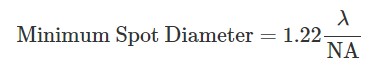 这种低波前误差使反射物镜具有受限的衍射或近衍射的性能。 衍射受限的物镜会产生由艾里斑片定义的小聚焦光斑尺寸,可以使用物镜和波长的数值孔径(NA)计算得出: