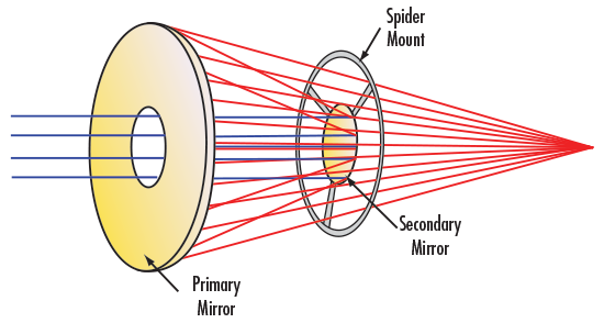 比较反射物镜时,需要考虑这些基于反射镜的系统*的两个参数:遮挡和透射波前。 在反射系统中,主镜的中央部分不会将光线传输到辅助镜,而是将其通过杂散光挡板反射回来。 为了避免这种情况,许多制造商在主镜的中央部分放置了吸收性涂层。 还有另外两个发生遮挡的位置,即主镜的直径和蜘蛛腿的宽度。 将遮盖作用的所有值都包括在规定的值中,尽管某些制造商只包括中央遮盖作用的值。 例如,EdmundOptics®在标准的反射物镜中包含了所有遮盖作用。