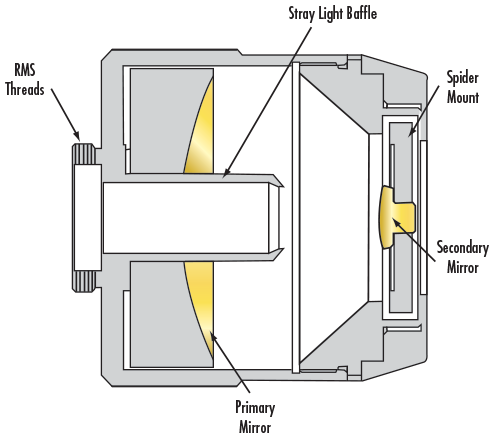 反射物镜常见的类型是两镜Schwarzschild物镜(图1)。 该系统由一个小直径的“辅助”反射镜和一个带有中心孔的大直径的“主”反射镜组成,该辅助反射镜由星形安装架固定在适当的位置。 主镜和副镜均镀有金膜,以更好地说明它们在反射物镜外壳内的位置。 这些基于反射镜的物镜有两种配置:用于聚焦应用的无限远校正和用于成像应用的有限共轭。