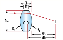 主平面 – 一个假设的平面,其中入射光线可以被认为是由于折射而弯曲的。 EFL 是从主平面位置定的。