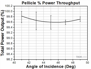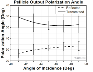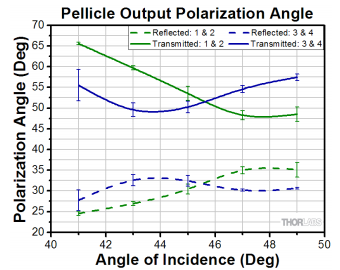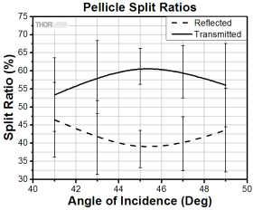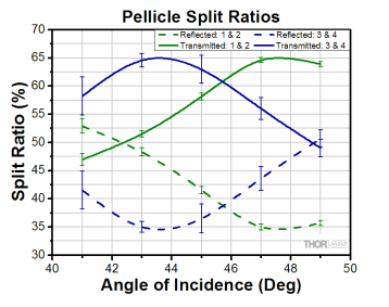 Ø薄膜分束镜提供了最佳通光量,但观察到分光比和偏振角有很大变化。 将薄膜的一半与另一半进行比较时,测量结果也存在空间依赖性。