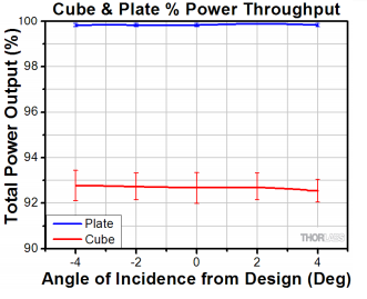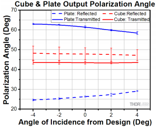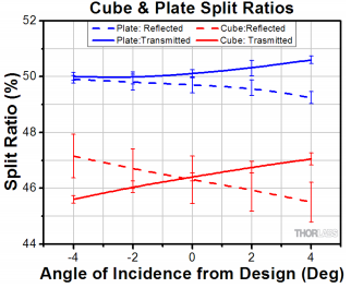 Ø在这里,我们根据入射角比较了 50:50 立方体和 50:50 平板分束镜的通光量、分光比和合成偏振角。