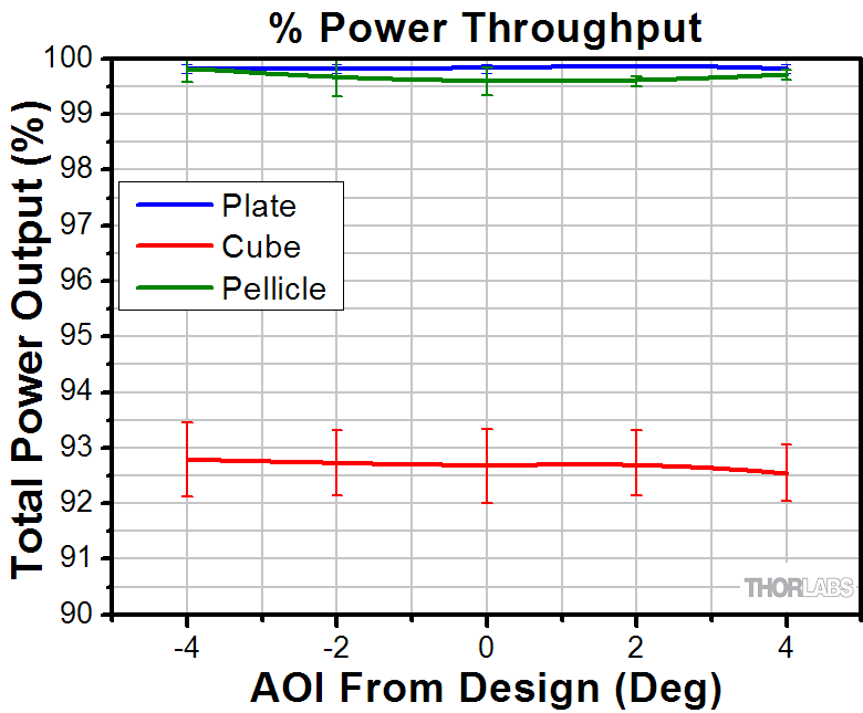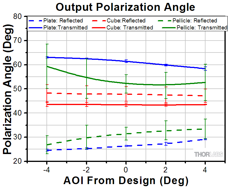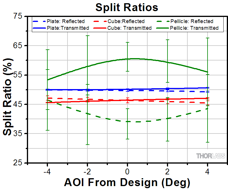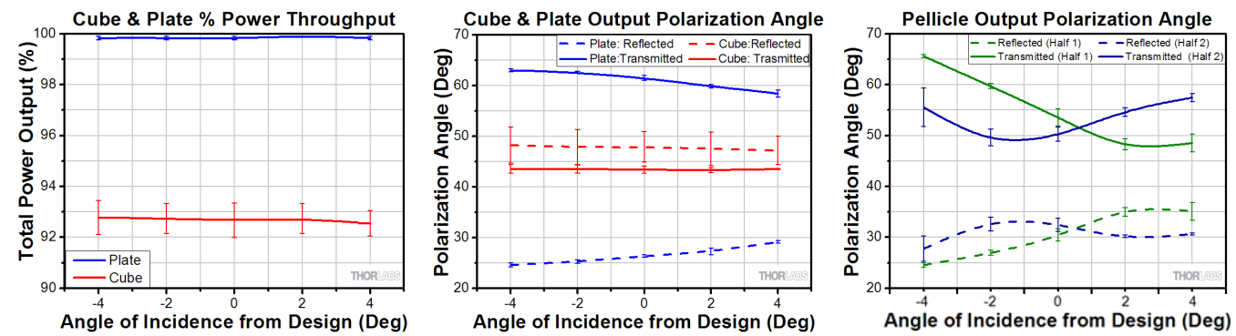 Ø进行测量以评估通过 50:50 立方体、50:50 板和 45:55 薄膜分束镜传播的光的通光量、分光比和偏振角,同时改变入射空间和角度。