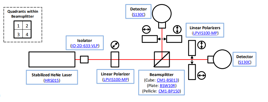 我们的实验使用HRS015稳定型HeNe激光器作为光源。使用一线偏振片将激光光束的偏振轴设置为45°,从而使等量的S偏振光和P偏振光入射在分束镜上。然后,将各分束镜放置到光路中,并将分离的两束光入射到适当的探测器上。在该配置下,测量通过光学元件的总功率、偏振态、分光比和入射角效应。