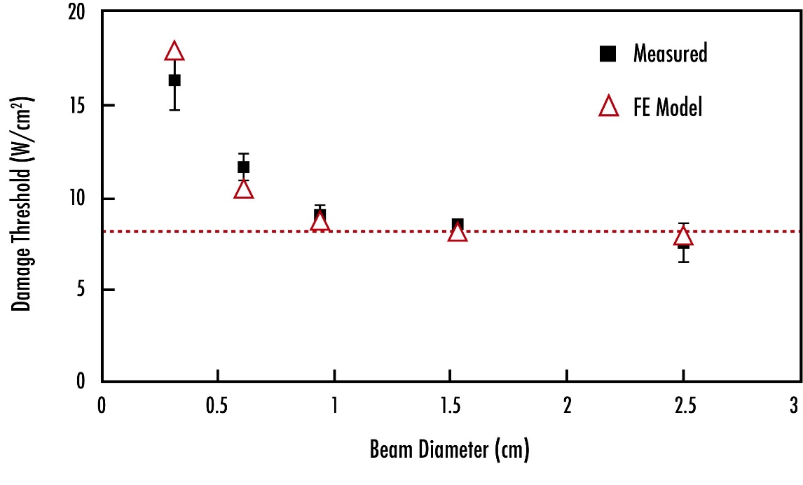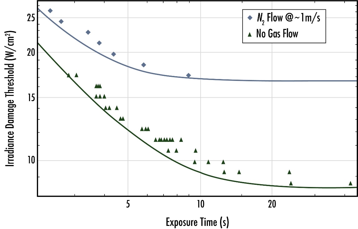 对于所考虑的所有光束直径,暴露于准连续和连续激光的样品的损伤阈值随着光束直径和暴露时间的增加而降低。光束越大,就越有可能在光学器件上遇到多个缺陷,从而降低损伤阈值。热量在样品中扩散的方式取决于所用基底的尺寸和热容。在样品上方有高速气流的条件下,光学器件表面的温度大大降低,因此,损伤阈值比未冷却的光学器件高得多。