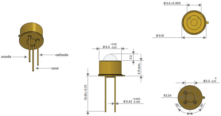 Optan包装包括带铜芯的插头和焊接到插头以提供密封的可伐帽。盖子包含一个熔融石英球透镜,可提供15°的标称视角。