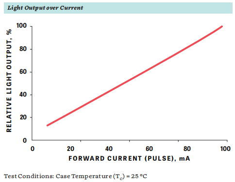 下图显示了光输出随正向电流的典型变化。将光输出数据归一化为100mA时的光输出。