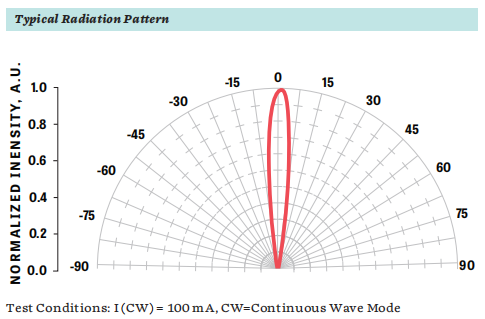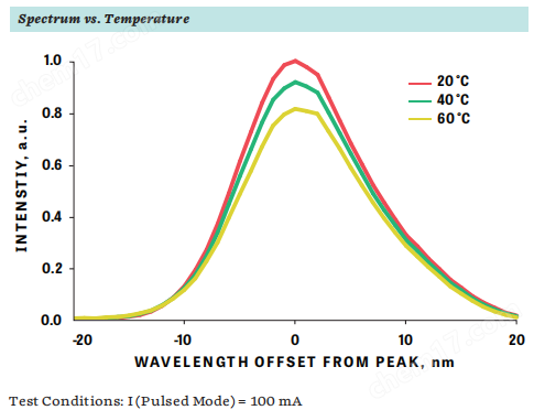 下图说明了随着电流变化的频谱特性的稳定性。随着驱动电流从20mA到100mA的变化,通常在峰值波长中没有观察到偏移。