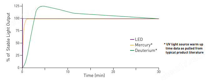 光输出的稳定性对于保证低基线噪声和提高吸收测量的检测至关重要。LED是一种稳定的光源,不受这些机制的干扰,从而导致其他传统UVC光源的波动。LED的光输出稳定性主要受结温的影响,可以通过一系列简单的热管理技术来维持。