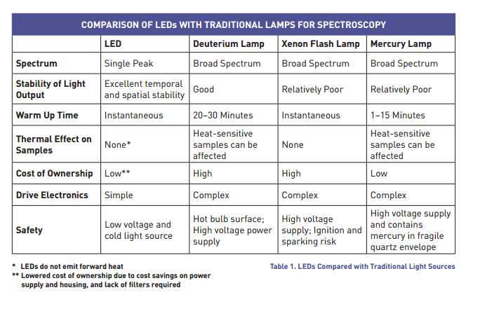 传统上,吸收和荧光光谱仪器已经利用了诸如氙、汞或氘等广谱灯,因为它们能在多个波长范围内产生足够的光。