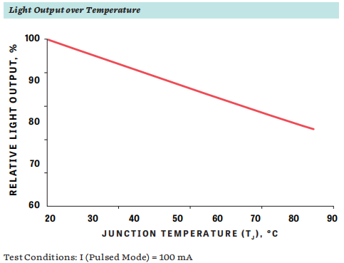 输出功率对结温非常敏感,因此建议采用适当的热管理技术来控制结温。较低的结温将确保LED的良好性能和使用寿命。下图显示了结温升高时光功率的变化。温度升高10°C时,典型的光输出下降5%。
