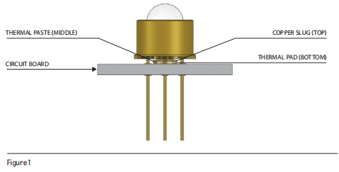 3.推荐的焊接方式如图1所示。此外,请确保插头中的中心铜芯已通过导热膏或油脂热连接到板上。应使用散热片,以在100 mA的向前电流下将LED的外壳温度保持在55°C以下。请参阅AKM散热管理说明AN003,以获取有关散热片的建议。