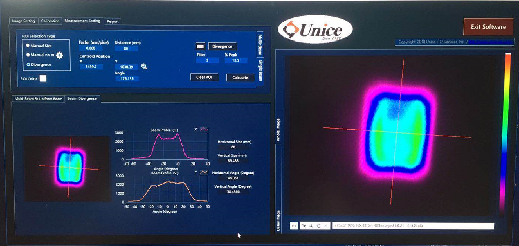 强度分布图像 出口报告和图像 为每个不同的测试目标预先保存数据 校准功能 通过硬件触发或连续抓取 搜索图像的质量中心 ROI选择 用鼠标选择 以固定角度分段n x m 测量项目 相对强度 光束轮廓 光束大小 局部/全局的对比 局部/全局*性 |